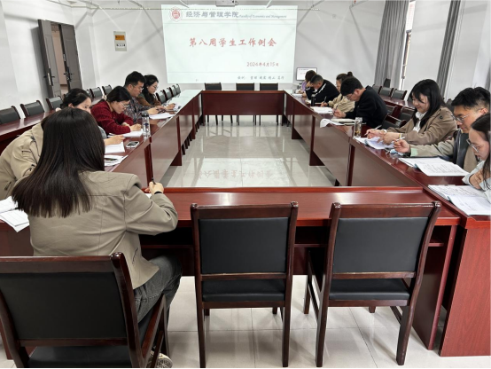 2024年4月15日14:30,太阳成集团tyc9728在行政楼725办公室召开本学期第八周学生管理工作例会,副院长秦品德、书记助理叶赵强、院长助理张珊以及全体辅导员参加会议,会议由吴玲院长主持。