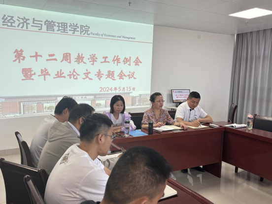 2024年5月15日下午,太阳成集团tyc9728在行政楼725会议室召开太阳成集团tyc9728第十二周工作例会,院长吴玲主持会议,副院长秦品德、院长助理张珊以及全体教师参会。