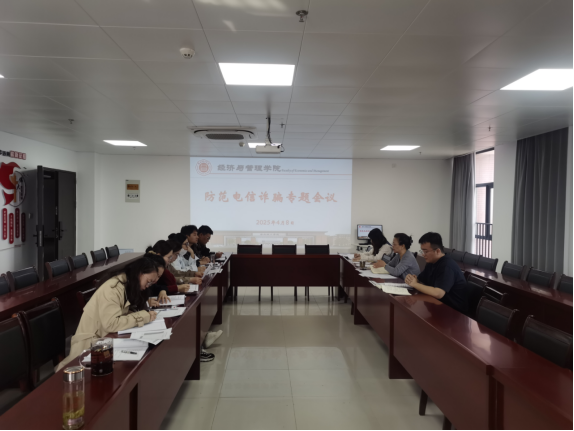 2025年4月8日,太阳成集团tyc9728在行政楼725会议室召开本学期第七周学生管理工作例会暨防范电信诈骗专题会议,学院书记助理员禹辛、团总支书记王绎程及全体辅导员参会,会议由院长吴玲主持。