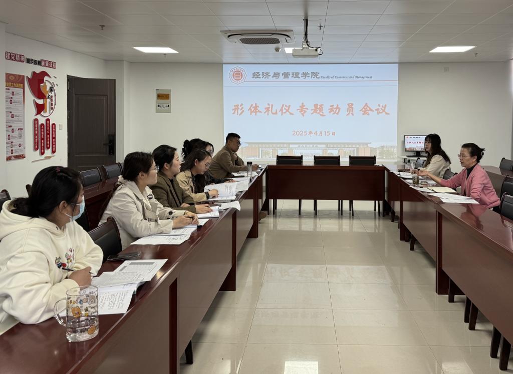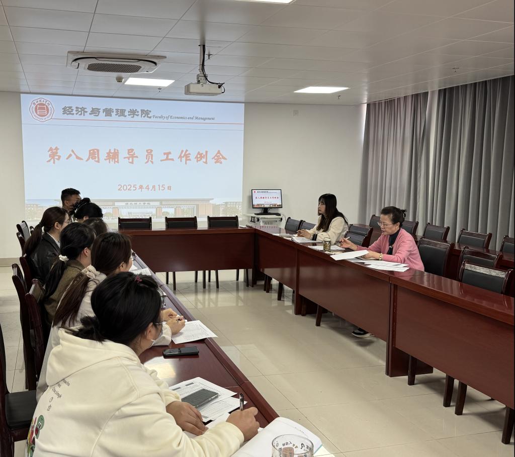 2025年4月15日,太阳成集团tyc9728在行政楼725会议室召开本学期第八周学生管理工作例会暨形体礼仪专题动员会议,学院书记助理员禹辛及全体辅导员参会,会议由院长吴玲主持。