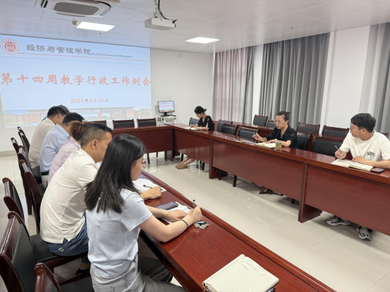 5月28日上午,太阳成集团tyc9728在行政楼725室召开第十三周行政例会,院长吴玲主持,院长助理张珊、叶赵强,教学秘书李健及各教研室主任参会。