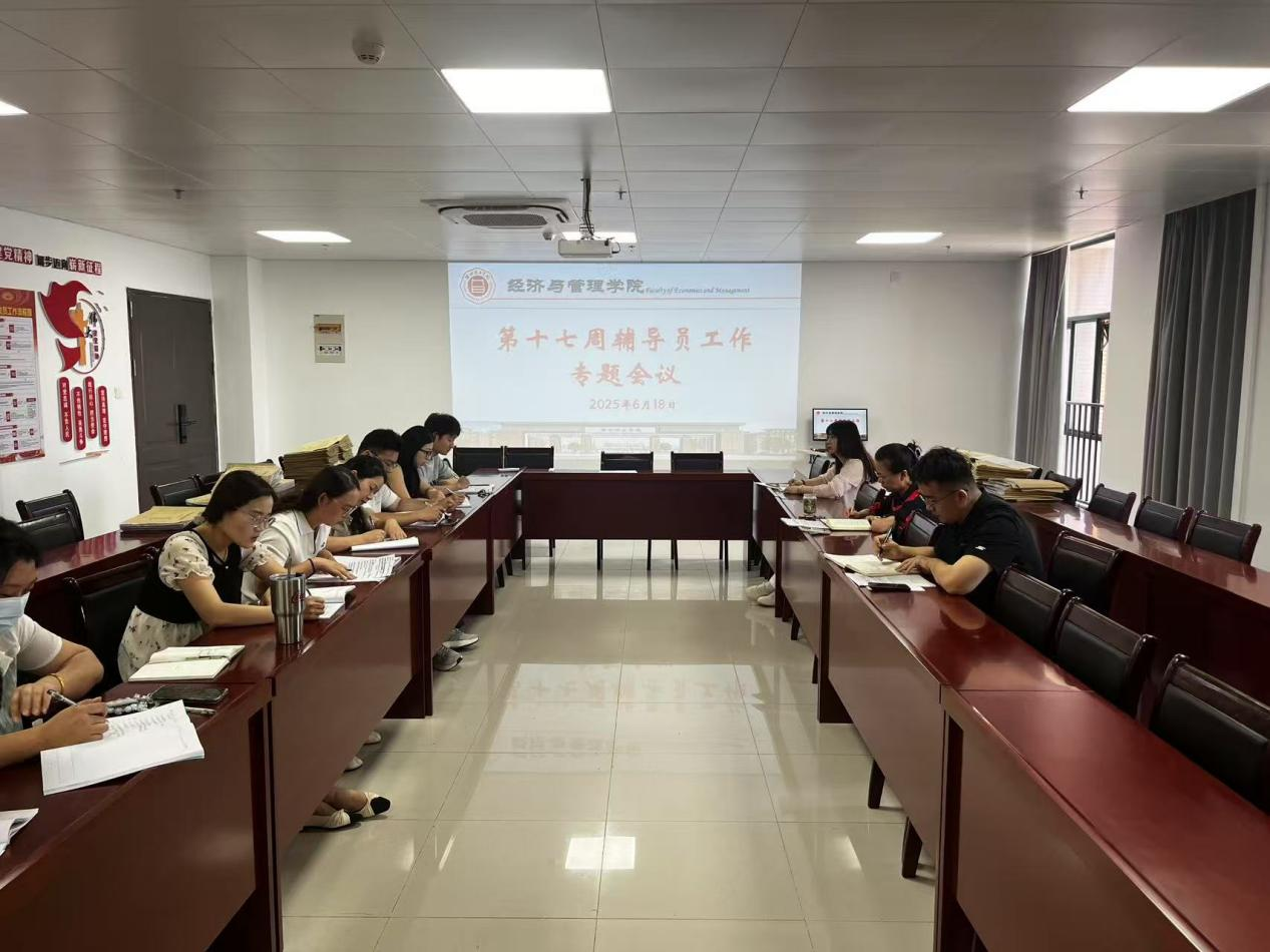 2025年6月17日,太阳成集团tyc9728在行政楼725会议室召开本学期第十七周学生管理工作例会暨暑期“三下乡”社会实践专题动员会议,学院书记助理员禹辛、团总支书记王绎程及全体辅导员参会,会议由院长吴玲主持。