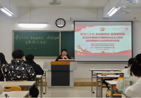 本次团日活动从习近平新时代中国特色社会主义思想世界观方法论的实践依据;习近平新时代中国特色社会主义思想世界观方法论的科学内涵;习近平新时代中国特色社会主义思想世界观方法论的丰富发展三个方面进行开展。我们要牢记习近平总书记对广大青年的寄语:“当代中国青年生逢其时,施展才干的舞台无比广阔,实现梦想的前景无比光明。”习近平总书记在党的二十大报告中给予青年的寄语:坚定不移听党话、跟党走,怀抱梦想又脚踏实地,敢想敢为又善作善成,立志做有理想、敢担当、能吃苦、肯奋斗的新时代好青年,让青春在全面建设社会主义现代化国家的火热实践中绽放绚丽之花!