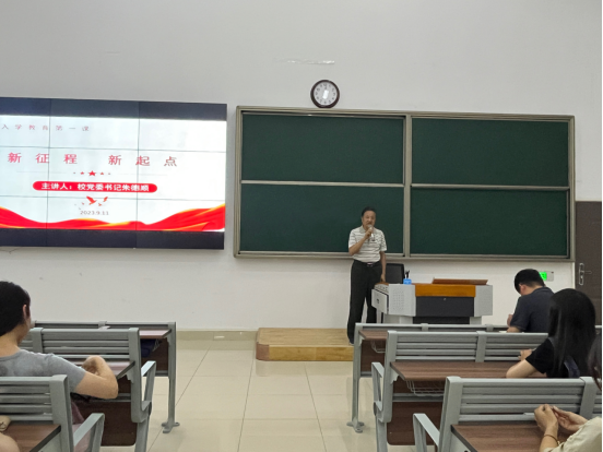 为全面贯彻落实党的教育方针,教书育人、培根铸魂,坚持学校领导带头讲思政课,2023年9月11日19时校党委书记朱德顺走进新生入学教育的课堂,为经济管理与建筑工程学院2023级新生带来“入学教育第一课”。