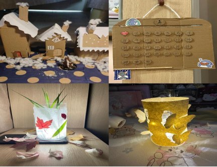 市场营销专业的高礼慧同学将废旧塑料瓶与笔芯结合制作塑料永生花摆件;人力资源专业的方月等同学将废旧快递纸盒改造成实用的桌面书架或美观的桌面摆件;经济学专业的蔡佳伊、胡明昭等同学把废旧鸡蛋托盘进行剪裁并加以手绘,制作成精美的风铃;物流管理专业的许娇萍、王梦茹等同学将废旧纸盒进行裁剪改装,制作成实用的日历挂件;经济学专业的刘思宇同学发挥个人特长,利用针线将废旧衣物进行裁剪、缝纫改造为实用挎包;电子商务专业的刘阳、张新颖等同学将一次性筷子、废旧纸箱、柚子皮相结合,制作成可简易的柚子空气净化器;除此之外还有各种笔筒、抽屉、垃圾桶、相框、肥皂盒的改造创意无限。