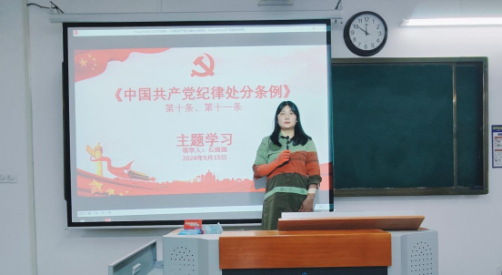 为深入学习贯彻习近平总书记关于党纪学习教育的重要讲话指示精神,学习领会新修订的《中国共产党纪律处分条例》和《中国共产党廉洁自律条例》及《中国共产党问责条例》,增强党员的纪律意识,强化正风肃纪。2024年5月15日,9728太阳集团经济学管理学学生党支部于一教219进行专题学习。会议由管理学党支部书记石园园领学,经济学、管理学学生党支部正式党员和预备党员以及经济学、管理学外出实习党员线上全员参加。