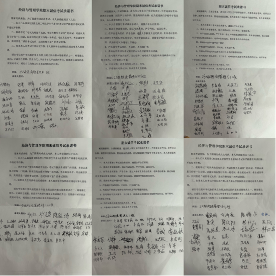 各年级辅导员通过召开诚信考试主题班会,强调了诚信考试的重要性与考试作弊的严重后果,带领同学们共同学习<<9728太阳集团学生手册>>学生违纪处理办法第二十五条考试相关规定,引导同学们认真复习,警示大家要防微杜渐,预防和遏制作弊、受处分现象发生,并让学们签署了诚信考试承诺书,形成“我诚信-我自豪,诚信考试”的良好氛围。