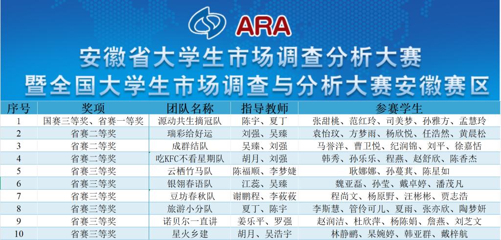 本次安徽赛区共计42所高校11368名本科生组队参与了省赛。经过激烈的角逐,最终我校陈宇、夏丁老师指导的“源动共生摘冠队”获得国赛三等奖、省赛一等奖,刘强、吴臻指导的“瑞彩给好运队”、吴臻、刘强指导的“成群结队”、胡月、刘强指导的“吃KFC不看星期队”等3支团队获得省赛二等奖,陈福顺、李梦婕指导的“云栖竹马队”、江蕊、吴臻指导的“银翎春语队”、谢鹏程、李莜莜指导的“豆坊春秋队”、夏丁、陈宇指导的“旅游小分队”、姜乐平、罗强指导的“诺贝尔一直讲队”、胡月、吴浩宇指导的“星火乡建队”等6支团队获得省赛三等奖。