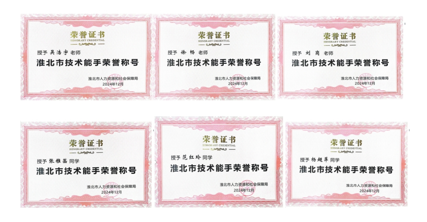 近日,经淮北市人力资源和社会保障局认定,我校教师吴浩宇、徐畅、刘岗,学生张雅菡、范红玲、杨超萍6名师生荣获“淮北市技术能手”荣誉称号。他们凭借扎实的专业素养和优异的实战能力,成功获此殊荣,为学校赢得了崇高荣誉,充分展现了我校在技能人才培养方面的显著成效。