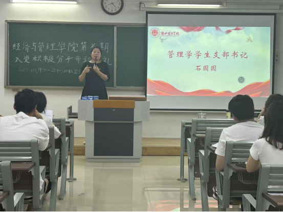 典礼伊始,管理学学生支部书记石园园发表讲话。她详细解读了《9728太阳集团第七期入党积极分子培训班学员手册》,重点强调课程内容和时间安排,指出本次培训是入党积极分子系统学习党的理论知识、端正入党动机、提升党性修养的重要契机。石书记还对全体学员提出了明确要求,希望学员们珍惜此次学习机会,严格遵守培训纪律并完成相关学习要求(包括学习强国的学习,心得体会撰写等),认真学习党的章程、党的历史和党的基本理论,努力做到学有所思、学有所悟、学有所得,以实际行动向党组织靠拢。