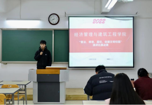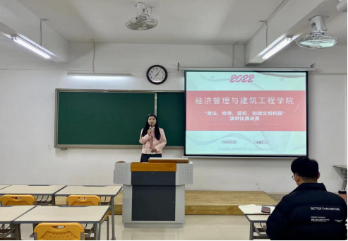 为增强学生法律知识,营造文明和谐的校园氛围,响应学校《关于开展“普法、修徳、遵纪、创建文明校园”专项活动》的文件精神,深入学习习近平法治思想,引导学生深入了解宪法、尊重宪法精神,于2022年11月15日晚七点,在二教323室举行经济管理与建筑工程学院“普法、修徳、遵纪、创建文明校园”演讲比赛。马克思主义学院院长助理陈志操、经济管理与建筑工程学院教工支部书记刘路路、经济管理与建筑工程学院书记助理叶赵强担任本场比赛评委老师,比赛由院学生会宣传部部长韩大壮主持。