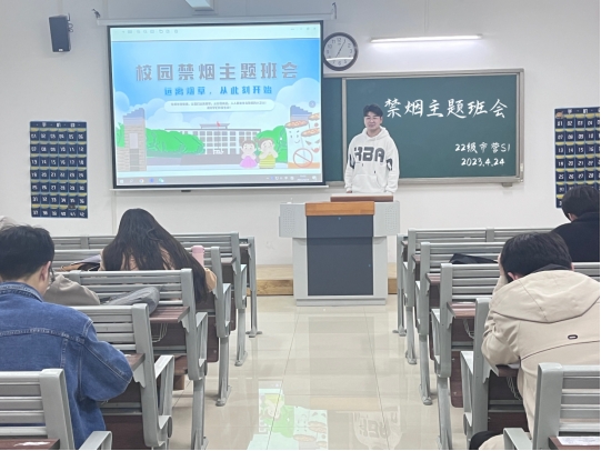 活动伊始,各班级分别召开“拒绝吸烟,做⽂明青年”主题班会,班会上同学们轮流发⾔,有的学生介绍了烟草的危害——现代医学证明吸烟是⼈类的第⼀杀⼿,烟草烟雾⾥有四千多种化学物质,其中有超过四⼗种会让⼈体致癌;有的利用图⽚介绍吸烟者的呼吸道、⼼⾎管、神经系统、消化系统等都有不同程度的伤害;有的专门介绍吸烟对未成年的身体和学业危害,吸烟者的智⼒效能⽐不吸烟者减低10.6%,还会影响⾝体发育,使思维变得迟钝,记忆⼒减退,影响学习等等。通过开展禁烟主题班会,各班级经自愿报名加班级内部投票选举的方式推选出学院28名校园禁烟大使。
