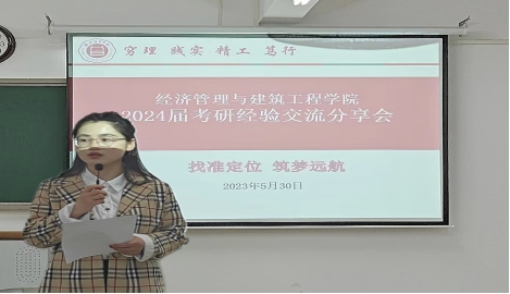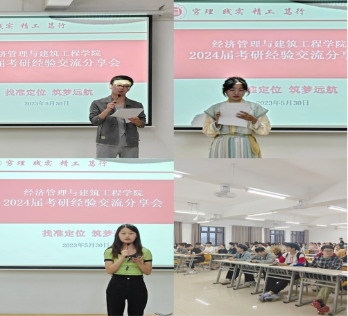 随着2023届全国研究生招生考试落下帷幕,2024届考研紧随其后,为传承我院首届毕业生考研文化精神,激发学生考研的热情,加强学生对考研的认识和了解,明确考研规划,挖掘自身潜能,树立考研必胜的自信,营造浓厚考研氛围,学院特邀2023年考研成功上岸的四位学生为学院各专业学生做考研经验交流分享。5月30日晚在2教323教室召开了经济管理与建筑工程学院首届考研经验分享交流会,学院书记助理叶赵强,考研成功上岸学生21级物流管理专业李晴、经济学专业黄顺、人力资源管理专业张梦茹、电子商务专业裘功浩,以及学院大一、大二和大三有考研意向学生参加此次会议,会议由22级辅导员张雨停主持。