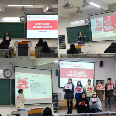 “趣味剪纸比赛”决赛于12月15日在一教406举行,由教育学院的闫敏、经管学院的李茹、王元钊和郑凡四位老师担任评委。决赛过程中,参赛选手从作品设计的思路来源、创作过程等多个方面对自己的作品进行汇报,进一步诠释了作品的丰富内涵,比赛现场气氛活跃。通过角逐,经济学专业的郑丽阳荣获一等奖,市场营销专业的程胜洁、经济学专业的张景康荣获二等奖,电子商务专业的李曼曼、市场营销专业的李斯慧、物流管理专业的周宇希荣获三等奖。