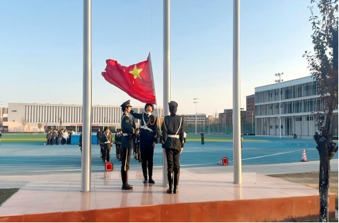 每周一的清晨,国旗护卫队的队员们步伐坚定、精神饱满,护送着鲜艳的五星红旗缓缓走向升旗台。随着激昂的《义勇军进行曲》响起,五星红旗冉冉升起,在晨光中迎风飘扬,点燃了全体师生的爱国情怀,也激发了大家对新学期的奋斗期待。