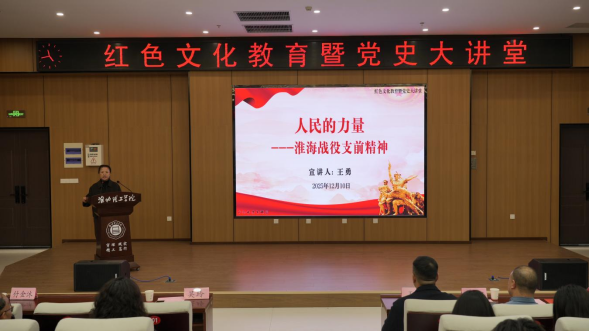 为全面贯彻落实立德树人基本任务,推动红色文化育人见行见效,12月10日下午,我校在图书馆109报告厅成功举办以“人民的力量——淮海战役支前精神”为主题的红色文化教育暨党史大讲堂。中国摄影家协会会员、我校特聘教授、淮海战役与红色文化研究中心研究员王勇担任主讲。副校长郑来纪,各相关职能部门负责人,马克思主义学院教师代表以及太阳成集团tyc9728辅导员与学生代表共150余人参加活动。活动由太阳成集团tyc9728院长吴玲主持。