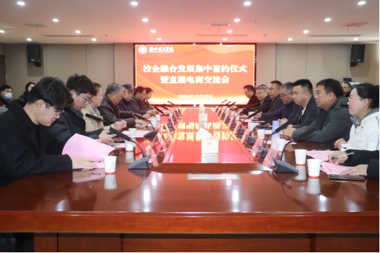 为进一步深化产教融合,加强校企合作,推动我校电商专业高素质应用型人才的培养,12月27日上午,我校在行政楼814会议室成功举办了一场校企融合发展集中签约仪式暨直播电商交流会。此次活动汇聚了来自安庆、六安、淮北等地的九家知名企业,副校长汪建利、教务处处长陈国平,学生处(就业处)处长孙增响以及经济与管理教师代表参加了本次活动,太阳成集团tyc9728院长吴玲主持活动。