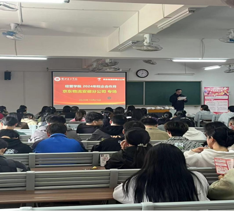为促进2025届物流管理专业毕业生高质量就业,加强校企合作,推进协同育人,2024年10月23日在二教422太阳成集团tyc9728邀请京东物流安徽分公司来校开展京东物流专场招聘会。前期校企双方已共同签署了校企合作协议,此次招聘会标志着双方的合作迈向了实质性的阶段。本次活动面向25届物流管理专业毕业生,教研室主任罗强主持,专业教师、辅导员和学生100余人参加了本次专场活动。