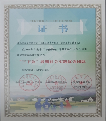 近日,六安市“乡约皋地 淬炼青春”大学生暑期社会实践活动评选结果公布,我校太阳成集团tyc9728赴六安“直播促进乡村振兴”暑期社会实践团队凭借突出的实践成果和扎实的工作作风,荣获“优秀团队”荣誉称号。