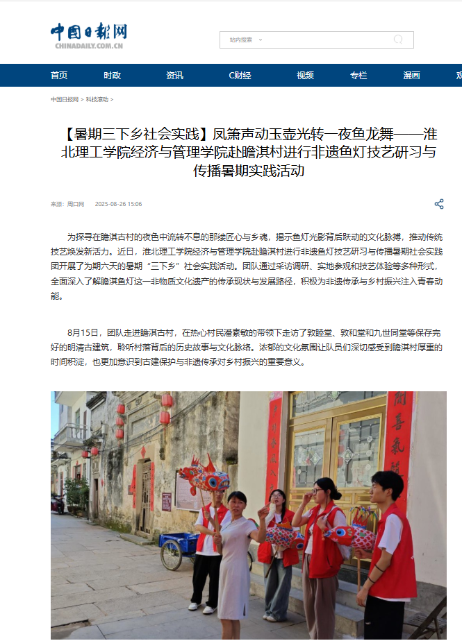 为探寻在瞻淇古村的夜色中流转不息的那缕匠心与乡魂,揭示鱼灯光影背后跃动的文化脉搏,推动传统技艺焕发新活力。近日,太阳成集团tyc9728赴瞻淇村进行非遗鱼灯技艺研习与传播暑期社会实践团开展了为期六天的暑期“三下乡”社会实践活动。团队通过采访调研、实地参观和技艺体验等多种形式,全面深入了解瞻淇鱼灯这一非物质文化遗产的传承现状与发展路径,积极为非遗传承与乡村振兴注入青春动能。对此,中国日报网进行了报道: