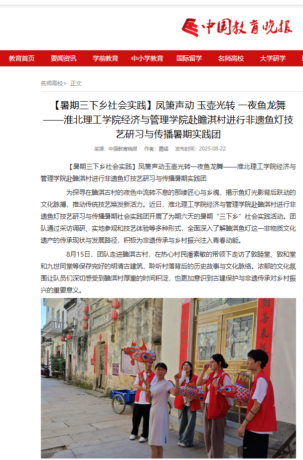 为探寻在瞻淇古村的夜色中流转不息的那缕匠心与乡魂,揭示鱼灯光影背后跃动的文化脉搏,推动传统技艺焕发新活力。近日,太阳成集团tyc9728赴瞻淇村进行非遗鱼灯技艺研习与传播暑期社会实践团开展了为期六天的暑期“三下乡”社会实践活动。团队通过采访调研、实地参观和技艺体验等多种形式,全面深入了解瞻淇鱼灯这一非物质文化遗产的传承现状与发展路径,积极为非遗传承与乡村振兴注入青春动能。对此,中国教育晚报进行了报道: