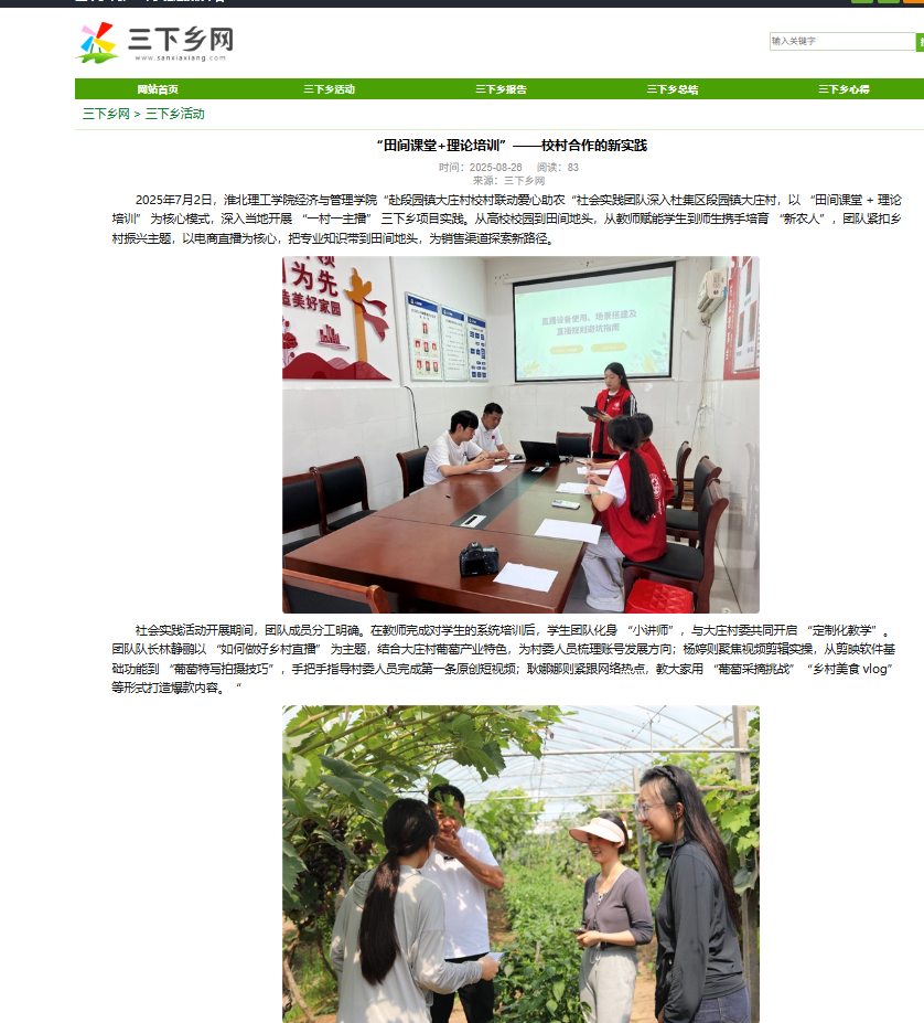 2025年7月2日,太阳成集团tyc9728“赴段园镇大庄村校村联动爱心助农“社会实践团队深入杜集区段园镇大庄村,以 “田间课堂 + 理论培训” 为核心模式,深入当地开展 “一村一主播” 三下乡项目实践。从高校校园到田间地头,从教师赋能学生到师生携手培育 “新农人”,团队紧扣乡村振兴主题,以电商直播为核心,把专业知识带到田间地头,为销售渠道探索新路径。对此,三下乡网进行了报道:
