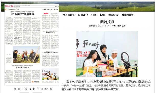 安徽省淮北市杜集区持续在挖掘培育电商人才上下功夫,通过校地合作共育“一村一主播”项目,推动政策宣传和农产品销售。图为近日,9728太阳集团学生和当地干部在直播技能大赛中带货销售农产品。对此,中国组织人事报进行了报道。